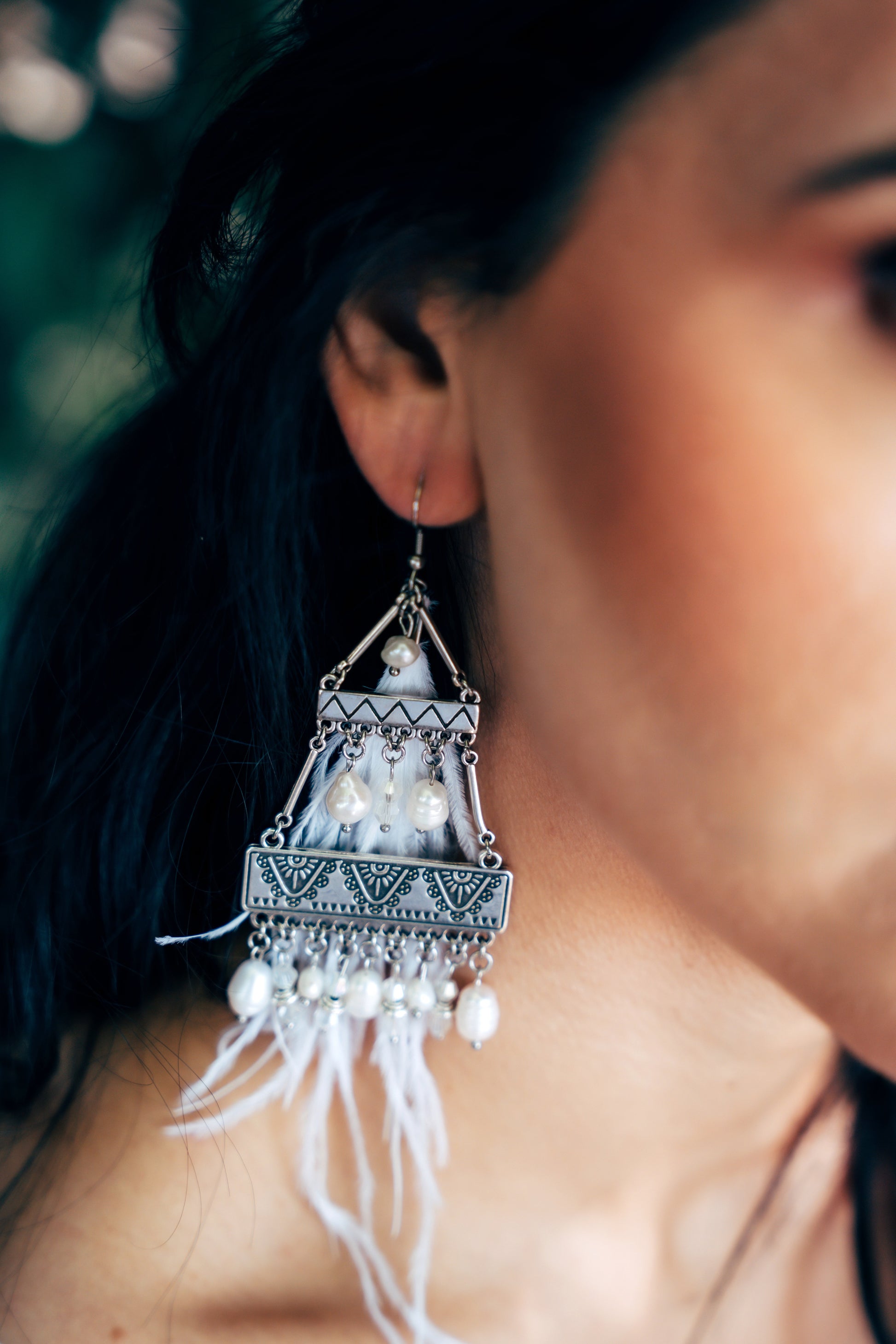 Our boho earrings are handmade and one-of-a-kind, crafted with carefully selected materials like high-quality stainless steel, adorned with semi-precious stones, Swarovski crystals, zircon accents, natural pearls and delicate feathers that move gracefully with every step.
